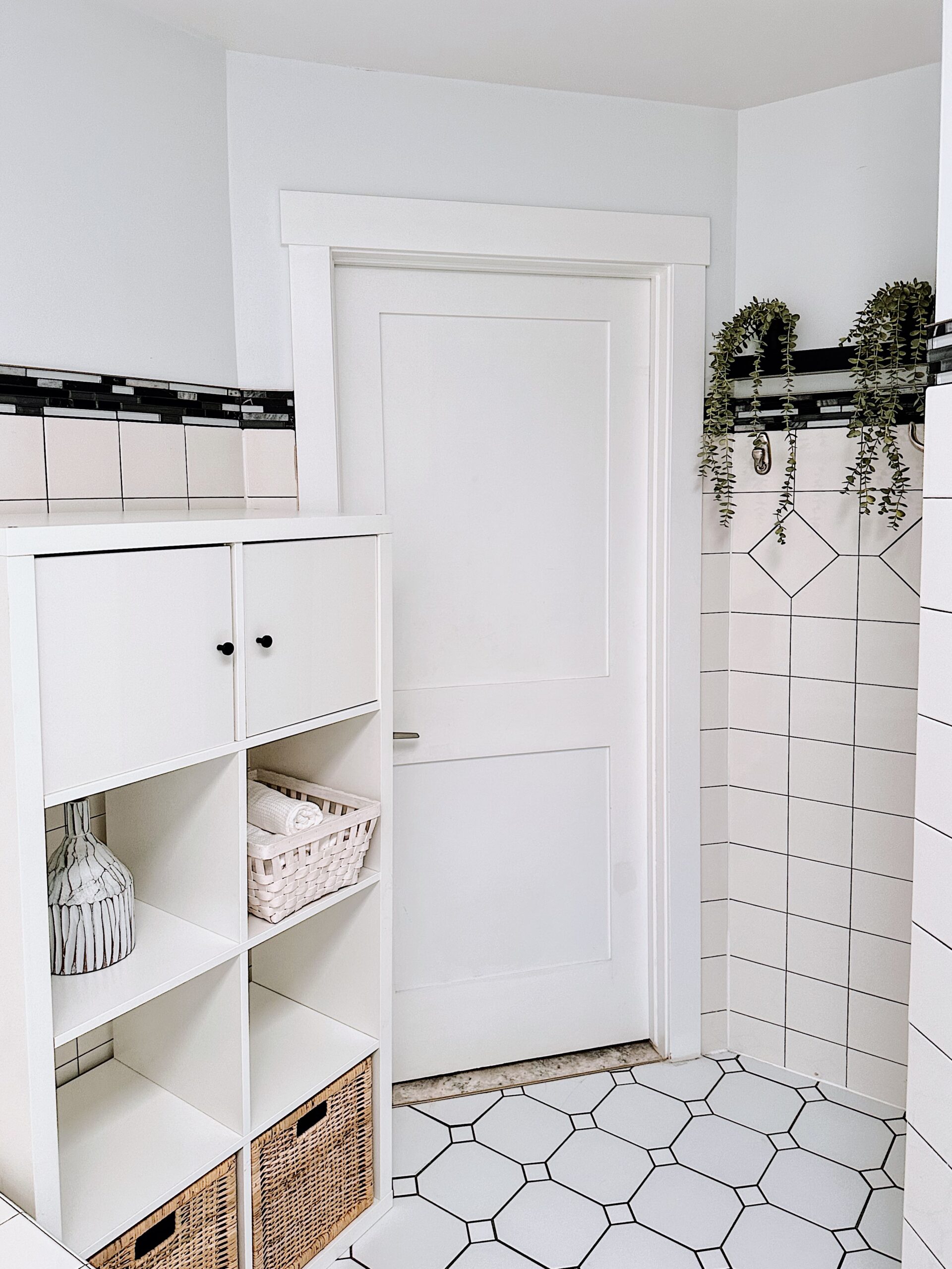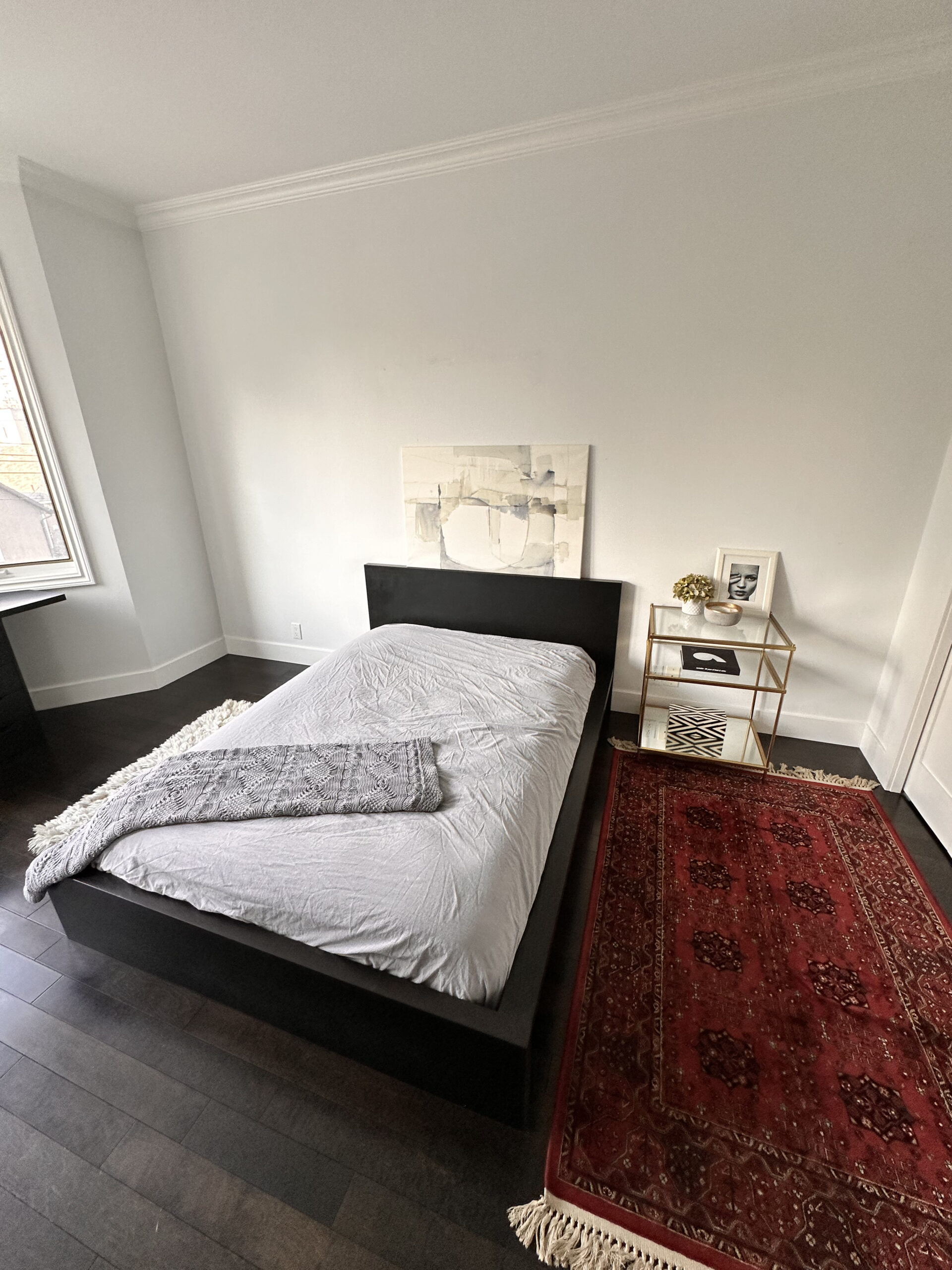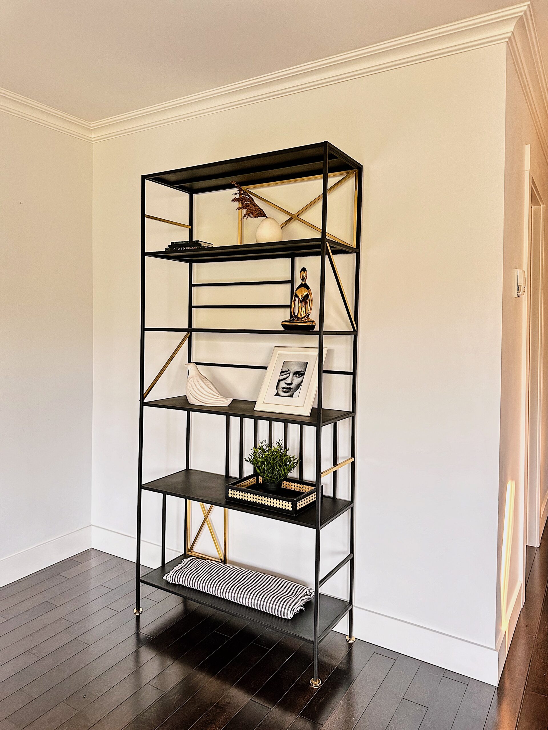 • Moving things around and repurposing them. Our last tenant made some changes to the whole setup. As you can see from the photos, I had to move the Kallax bookshelf back to its initial purpose, hang the artwork, and finish the vignette with a greenery vase. Anchoring is crucial to connecting a floor element like a bookcase to a wall element like artwork, mirrors, or lighting.