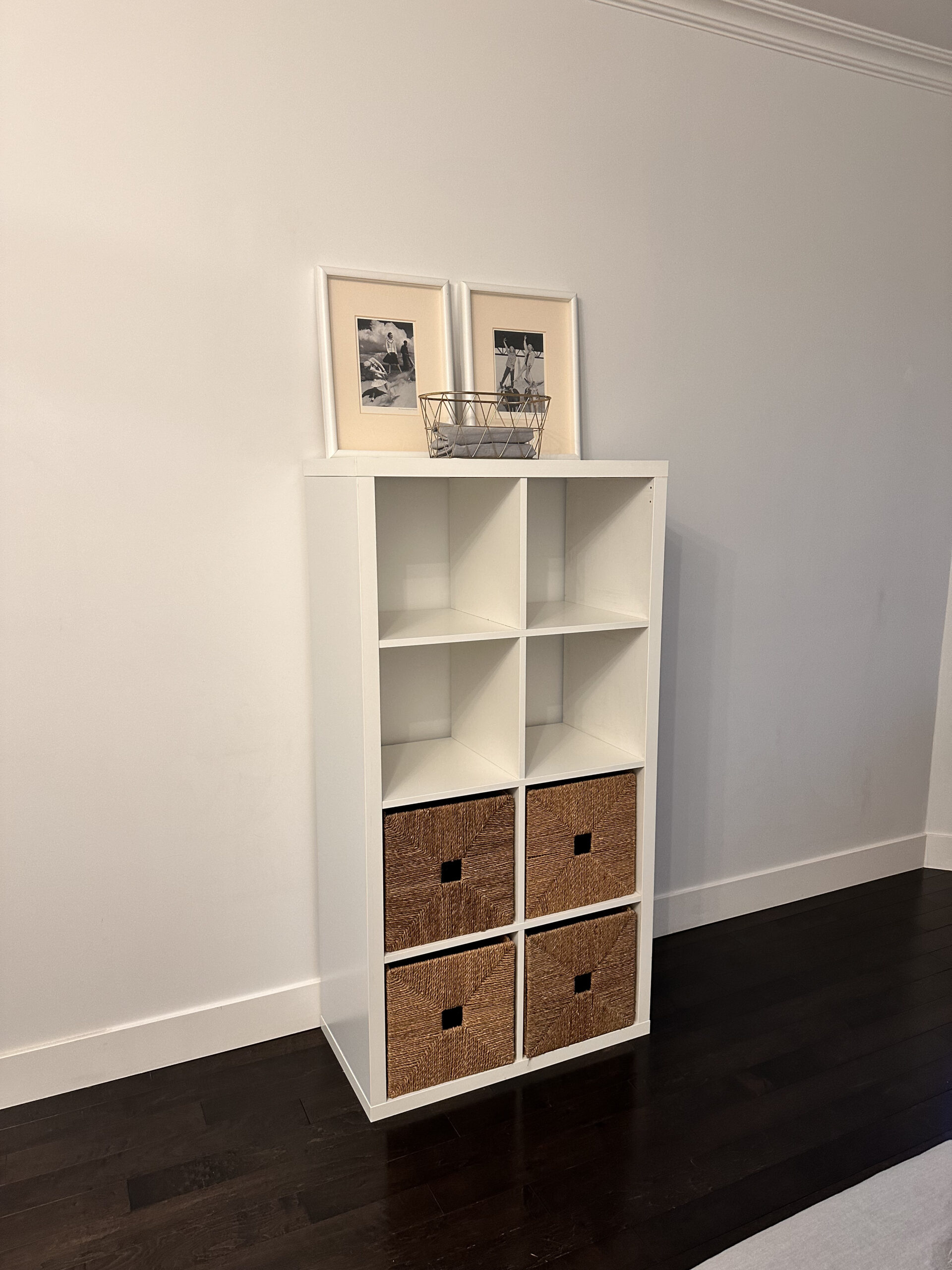 - Moving things around and repurposing them. Our last tenant made some changes to the whole setup. As you can see from the photos, I had to move the Kallax bookshelf back to its initial purpose, hang the artwork, and finish the vignette with a greenery vase. Anchoring is crucial to connecting a floor element like a bookcase to a wall element like artwork, mirrors, or lighting.